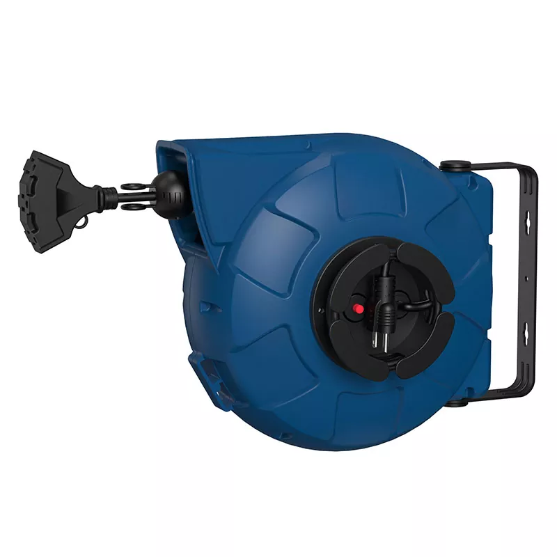 Челична заграда за монтирање на ѕид, цврсто пластично куќиште и практична рачка за носење: калемата за електричниот кабел е идеално продолжување на кабелот.